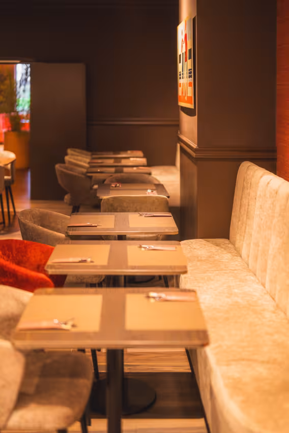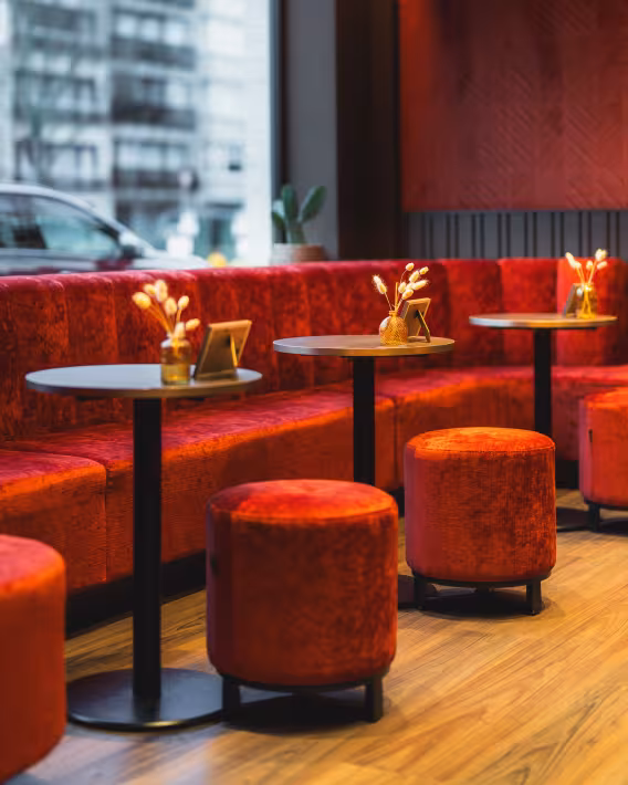 De barkrukken in velours, comfortabele zitbanken en bistrotafels zijn zorgvuldig op elkaar afgestemd en vervaardigd met kwaliteitsvolle materialen die zowel mooi als duurzaam zijn.